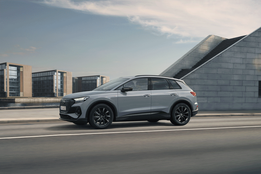 Q4 e-tron er en praktisk SUV med imponerende plass og premiumfølelse. Den har et moderne, skarpt design med en markant front, aerodynamiske linjer. quattro firehjulstrekk er standard, og med forvarming av batteriet lades bilen raskt selv under kalde forhold.